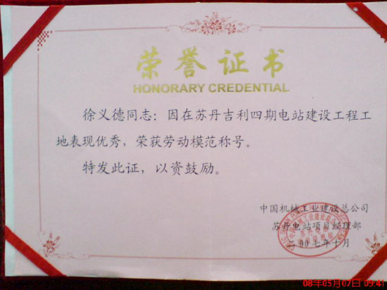 中昇建機工程師徐義德榮獲蘇丹吉利電廠四期工程2007年度勞動模范稱號