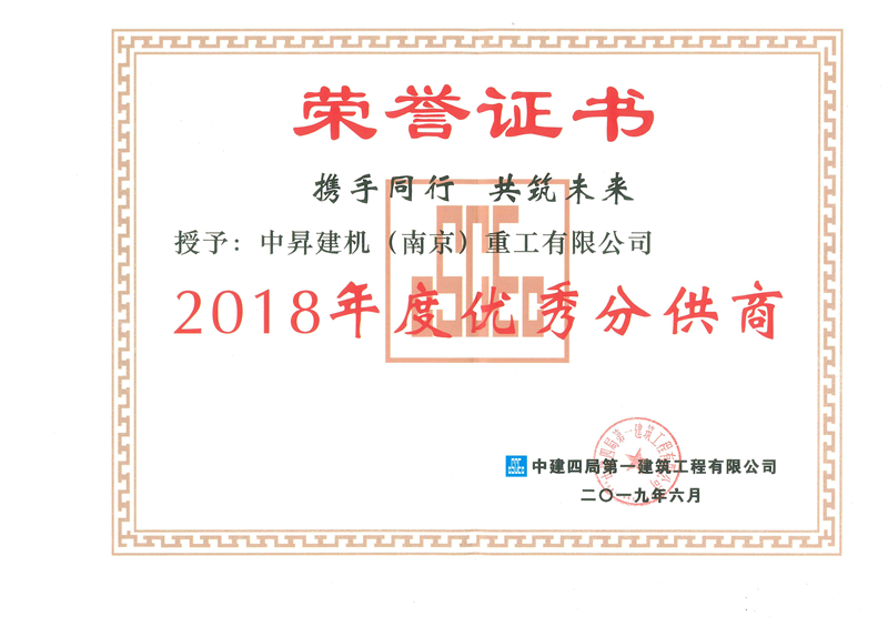 2019年7月,中昇建機(jī)代表應(yīng)邀出席中建四局第一建筑工程有限公司(以下簡(jiǎn)稱(chēng)“中建四局一公司”)“2019年項(xiàng)目建設(shè)總結(jié)表彰大會(huì)”,中昇建機(jī)以?xún)?yōu)異的產(chǎn)品和服務(wù)在眾多供應(yīng)商中脫穎而出,榮獲“2018年度優(yōu)秀分供商”榮譽(yù)稱(chēng)號(hào)。