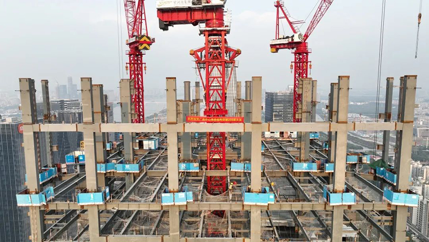 項目攻堅克難、晝夜運作,主體高度從150米到200米僅耗時126天;面對鋼管巨柱工序復雜、超高泵送、塔吊附著難度高等內部重難點。由我公司生產ZSL2700一臺、ZSL850兩臺動臂式塔機為項目的順利進行起到了積極作用。