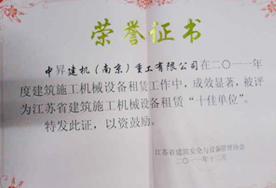 熱烈祝賀中昇建機(南京)重工有限公司于2011~2012年度被評為江蘇省建筑施工機械設備租賃“十佳單位”! 2012-06-26 |