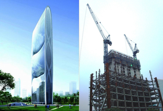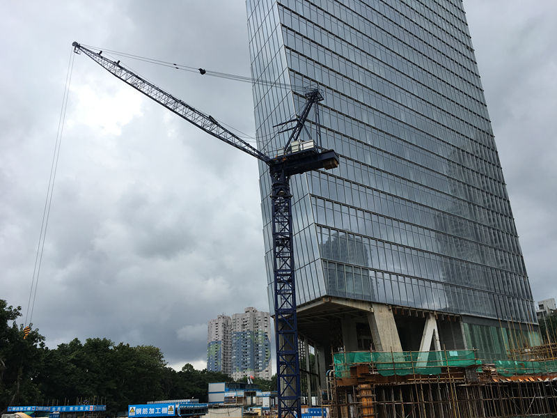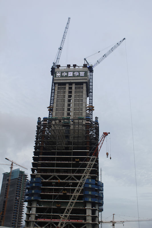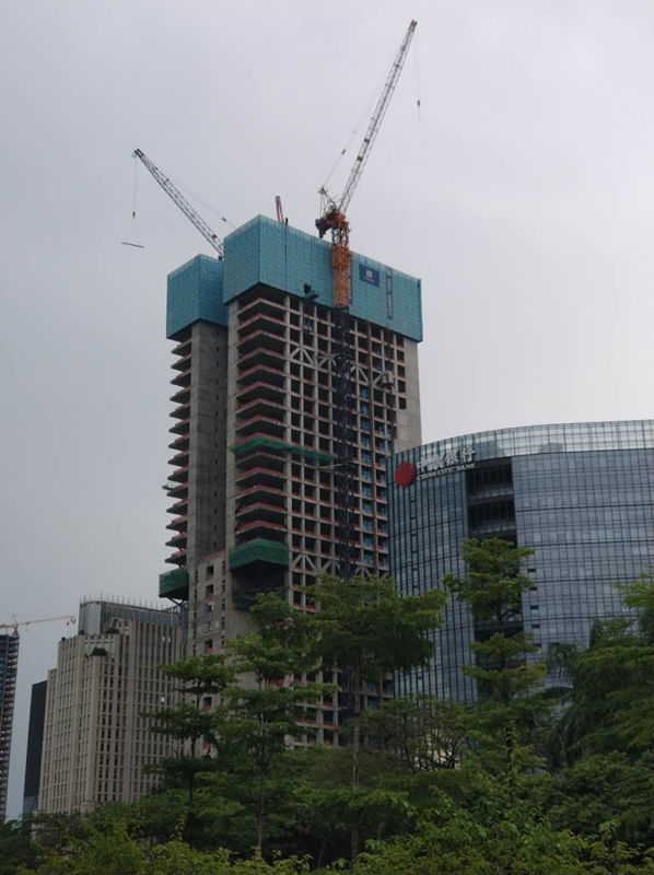建筑高度330m,采用中昇建機(jī)ZSL1000兩臺,最大吊重64t