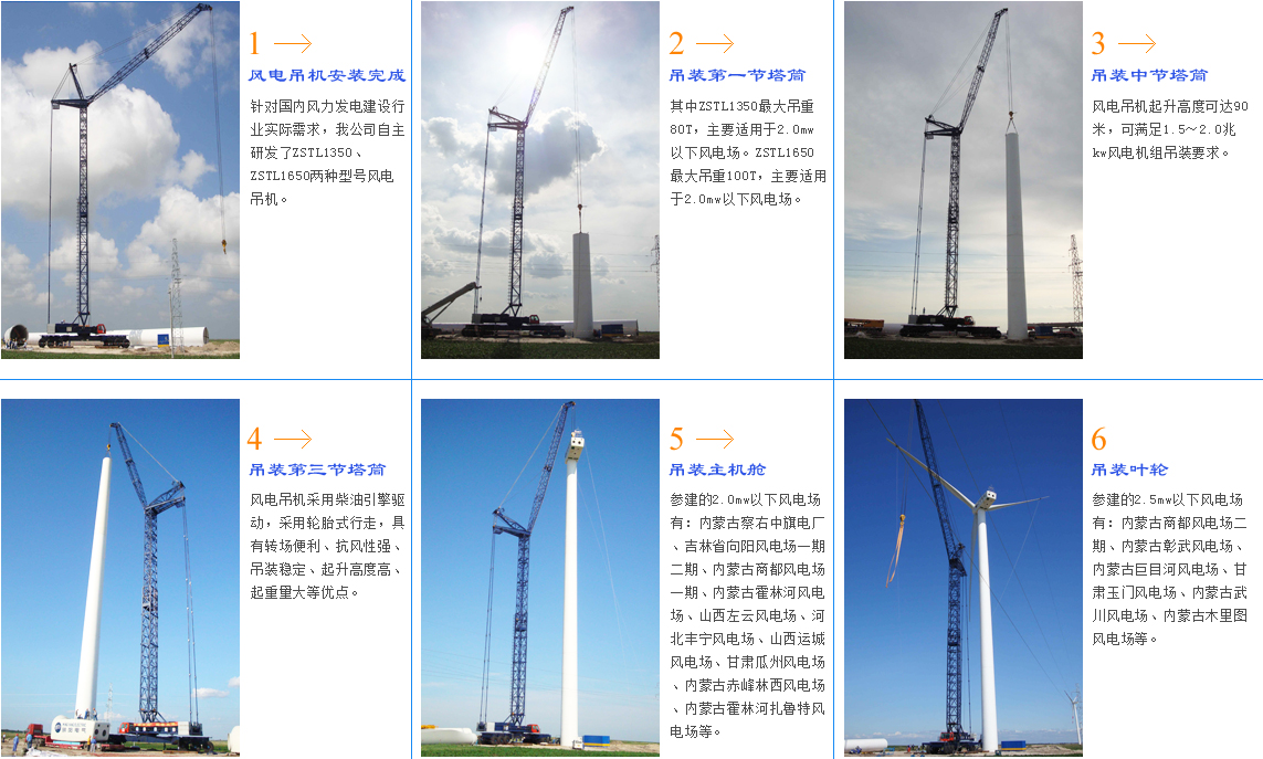 我公司自主研發了ZSTL1350、ZSTL1650兩種型號風電吊機,其中ZSTL1350最大吊重80T,主要適用于2.0mw以下風電場。ZSTL1650最大吊重100T,主要適用于2.0mw以下風電場。
